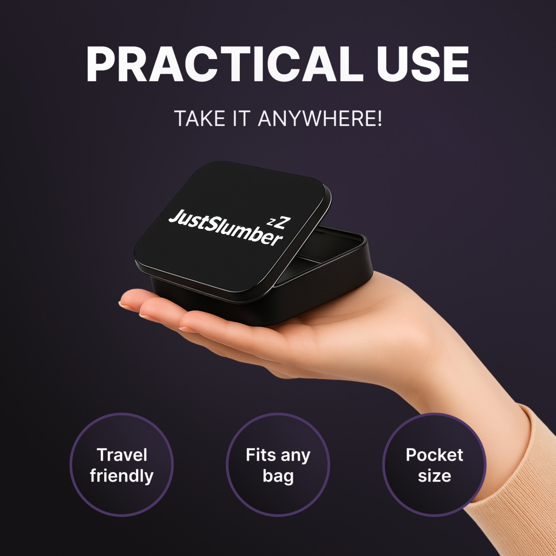 Keep your JustSlumber Mouth Tape fresh, clean, and easy to travel with — in our sleek, reusable storage tin designed for everyday convenience.